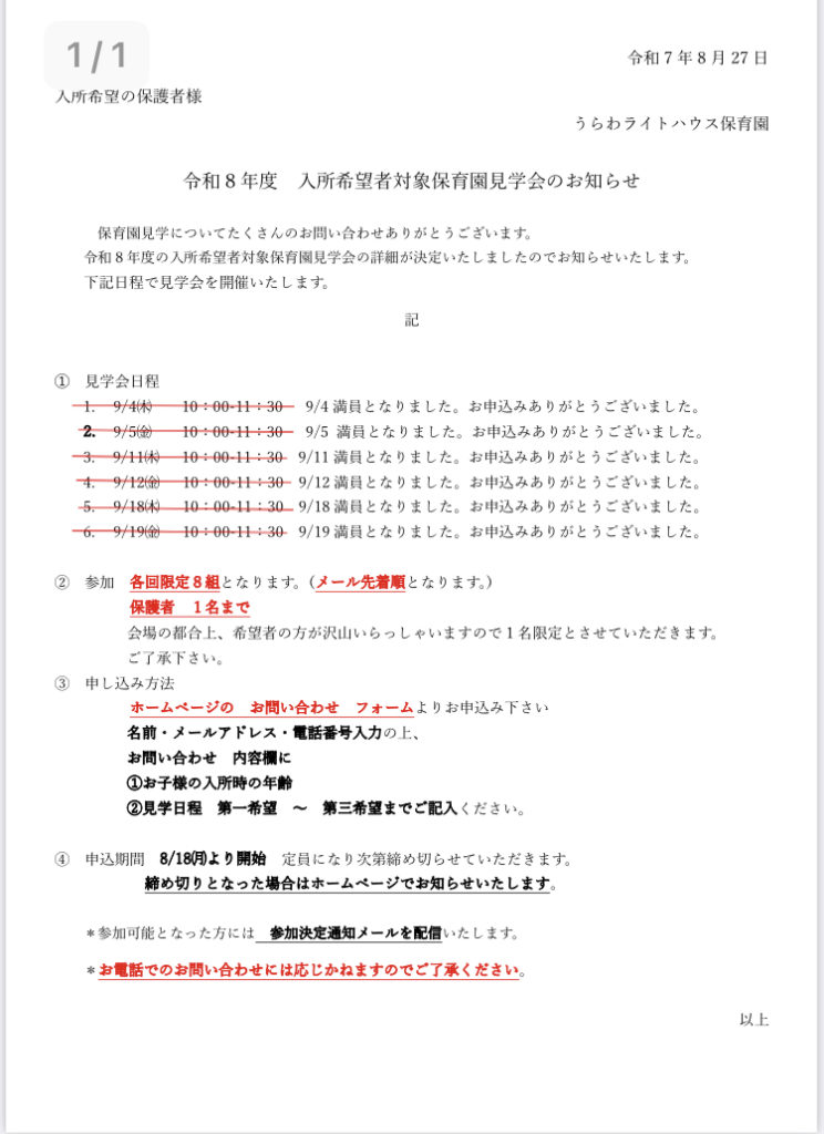 入所見学の沢山の申し込みありがとうございました。各回満員となりましたので申込受付終了させていただきます。残念ながら見学できない保護者の方におかれましてはホームページの内容などをご覧になりご検討いただければ幸いです。